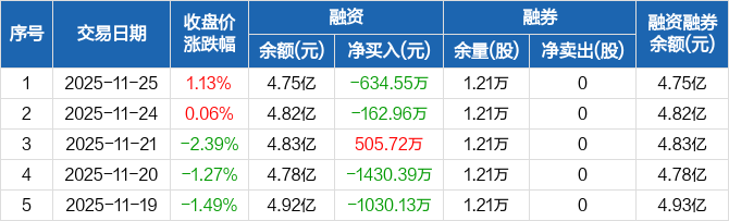融资方面,当日融资买入545万元,融资偿还1179.55万元,融资净偿还634.55万元。融券方面,融券卖出0股,融券偿还0股,融券余量1.21万股,融券余额19.54万元。融资融券余额合计4.75亿元。