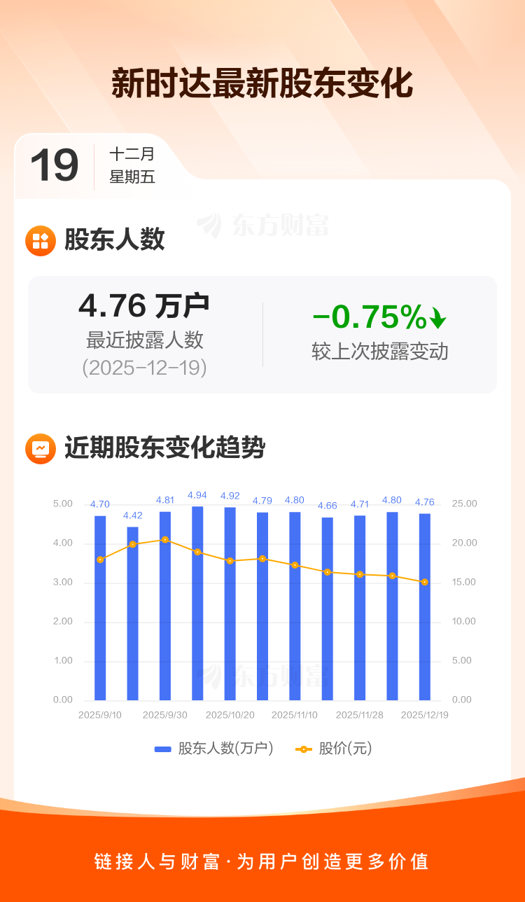 新时达最新披露数据显示,截至12月19日公司股东户数为4.76万户,较上期(2025年12月10日)减少358户,降幅为0.75%。户均持有流通股数量由上期的1.10万股上升至1.11万股,户均持股金额由上期的17.50万元减少至16.74万元。
