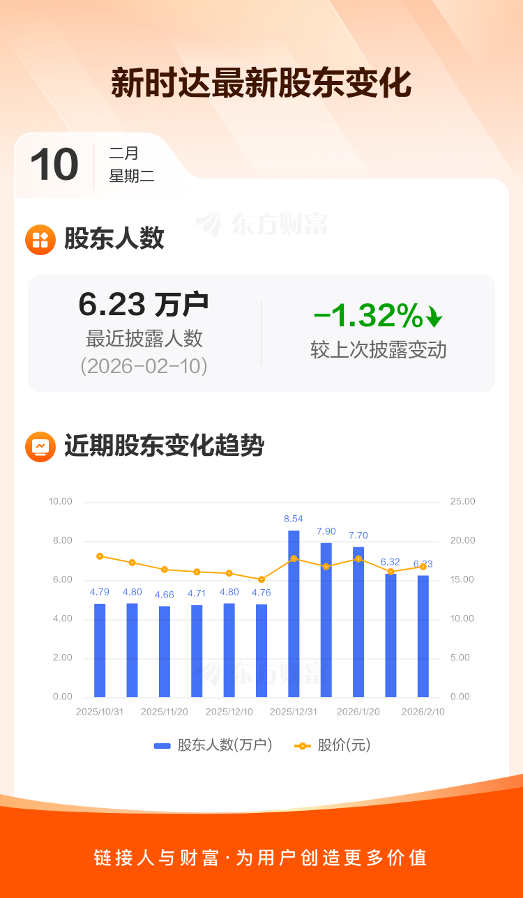 新时达最新披露数据显示,截至2月10日公司股东户数为6.23万户,较上期(2026年1月30日)减少833户,降幅为1.32%。户均持有流通股数量由上期的8379股上升至8491股,户均持股金额由上期的13.47万元增加至14.19万元。