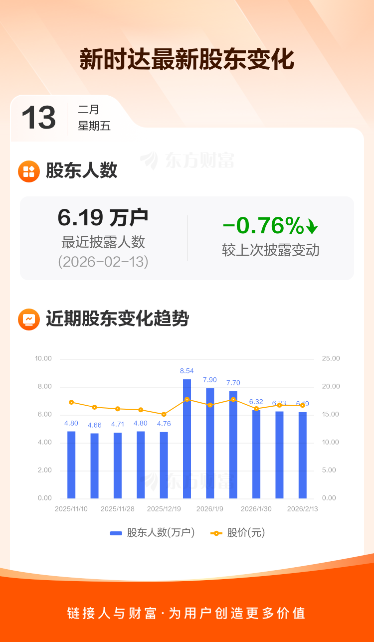 新时达最新披露数据显示,截至2月13日公司股东户数为6.19万户,较上期(2026年2月10日)减少474户,降幅为0.76%。户均持有流通股数量由上期的8491股上升至8556股,户均持股金额由上期的14.19万元增加至14.26万元。
