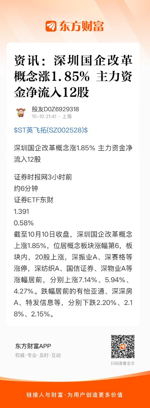 截至10月10日收盘,深圳国企改革概念上涨1.85%,位居概念板块涨幅第6,板块内,20股上涨,深振业A、深赛格等涨停,深纺织A、国信证券、深物业A等涨幅居前,分别上涨7.14%、5.94%、4.27%。跌幅居前的有怡亚通、深深房A、特发信息等,分别下跌2.20%、2.18%、2.15%。