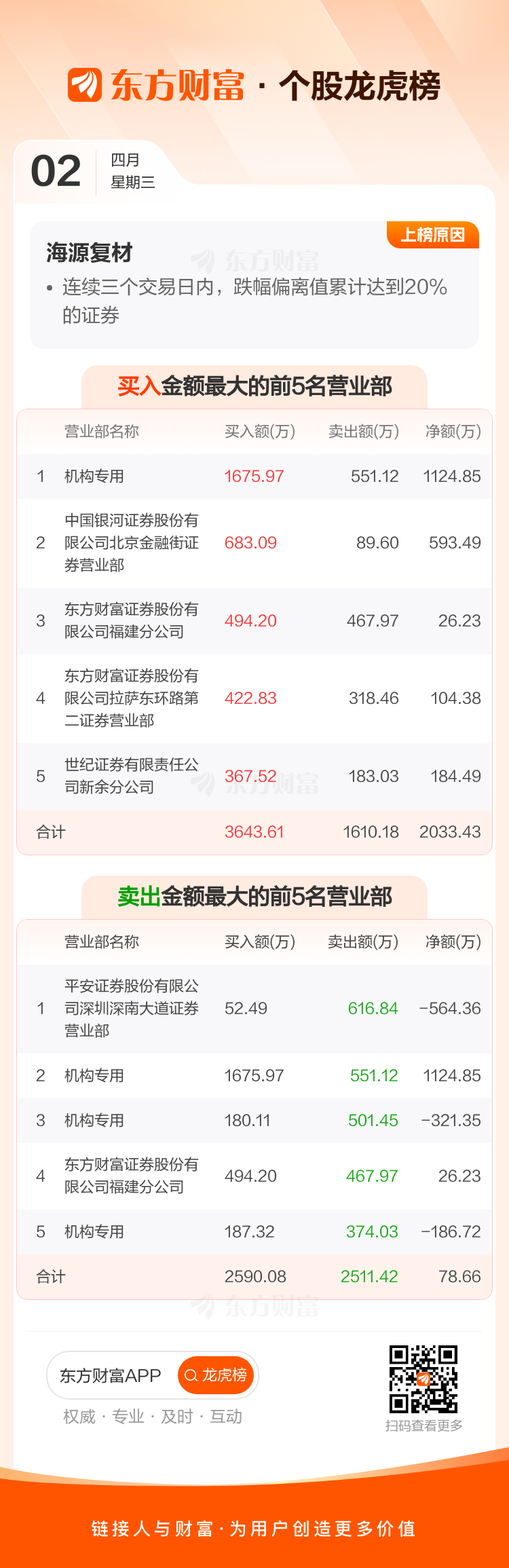 交易所2025年4月2日公布的交易公开信息显示,海源复材因成为连续三个交易日内,跌幅偏离值累计达到20%的证券上榜。海源复材当日收报7.38元,涨跌幅-3.15%,换手率10.98%,成交额2.16亿。异常期间3月31日至4月2日,期间涨幅-21.57%,累计偏离值-21.00%,区间成交额2.94亿。