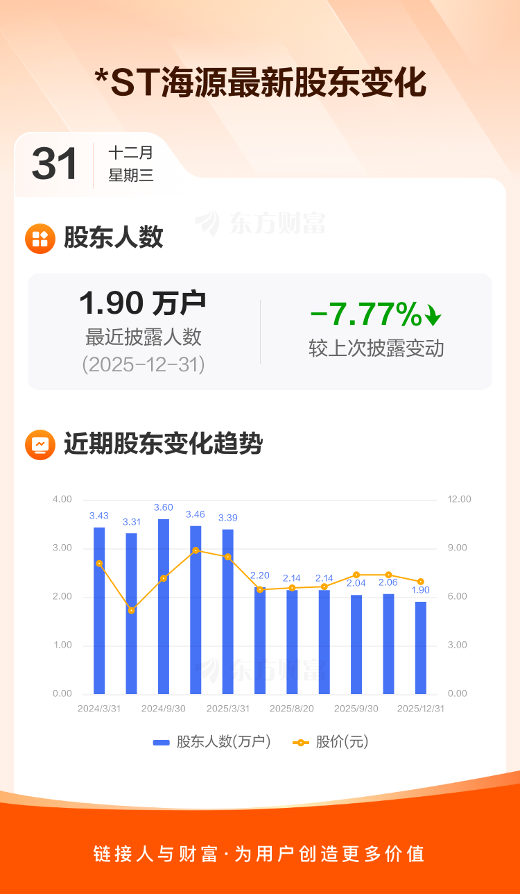 *ST海源最新披露数据显示,截至12月31日公司股东户数为1.90万户,较上期(2025年11月30日)减少1600户,降幅为7.77%。户均持有流通股数量由上期的1.26万股上升至1.37万股,户均持股金额由上期的9.29万元增加至9.50万元。