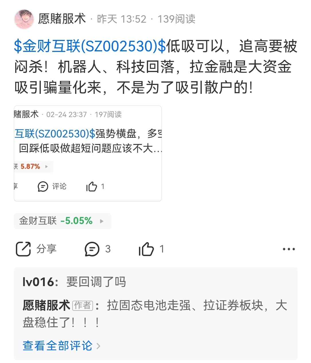$金财互联(SZ002530)$ 今天果然闷杀!没有人昨天追高吧!互联金融证券拉升不就是拉大盘所需!!今天上午拉银行很危险!