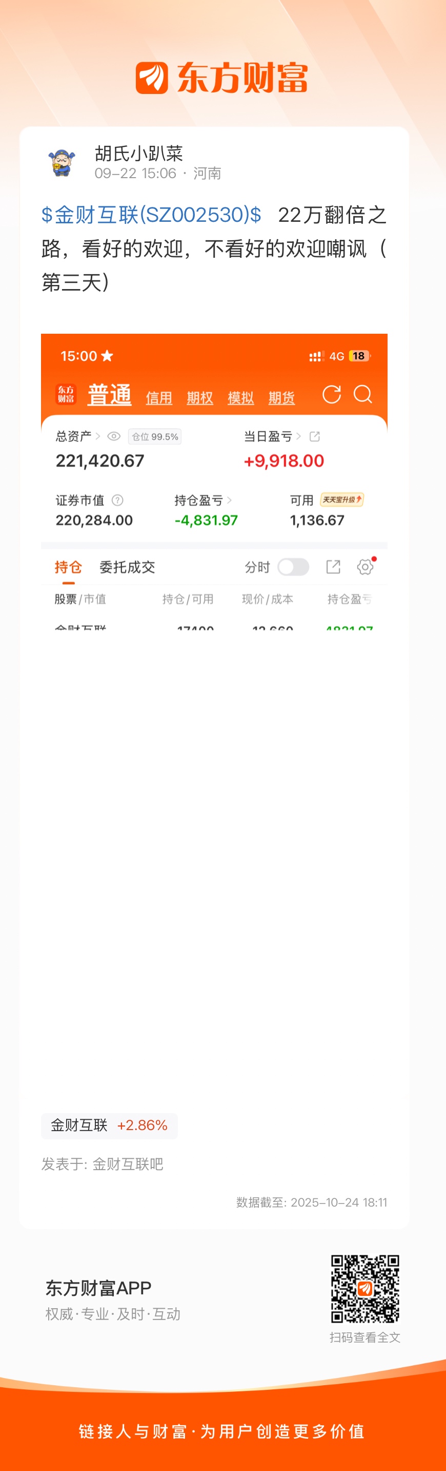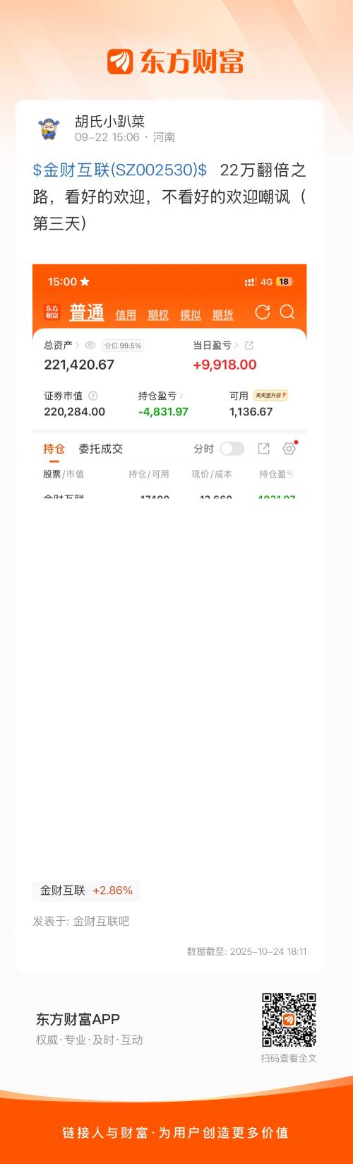 $金财互联(SZ002530)$  22万翻倍之路,看好的欢迎,不看好的欢迎嘲讽(第三天)