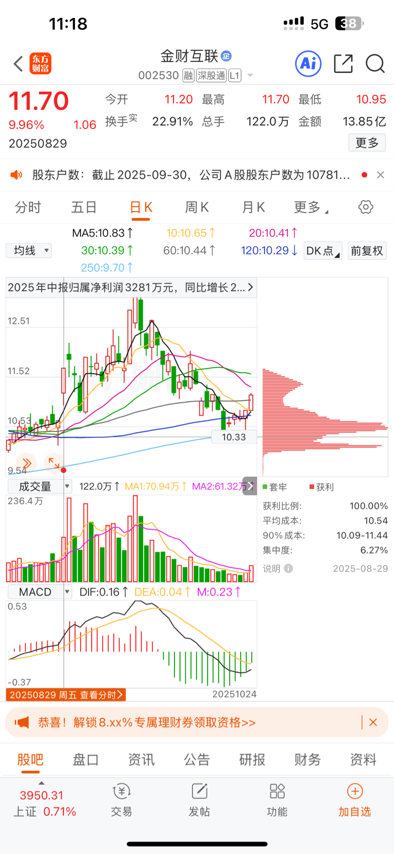 $金财互联(SZ002530)$ 也就一个涨停 下周二开盘赶紧卖