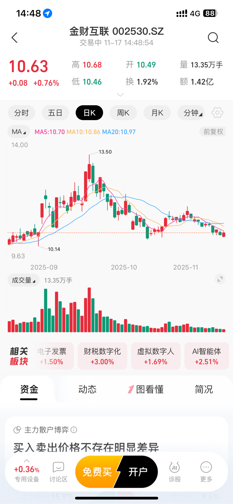 $金财互联(SZ002530)$ 板块都红冒烟了,成交量越来越低