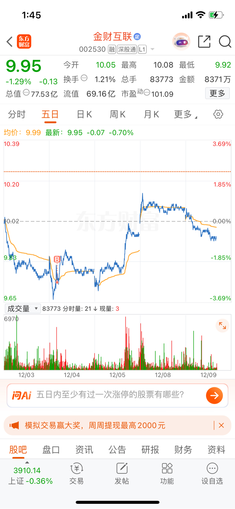 $金财互联(SZ002530)$ 酒菜们快买让主力砸下来老子还赚的怎么办?快加油买呀酒菜们