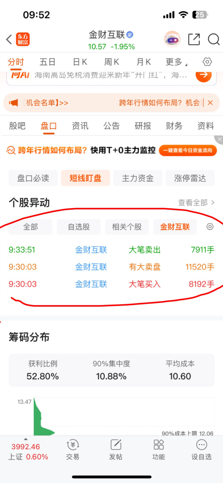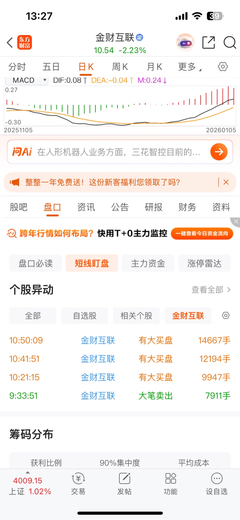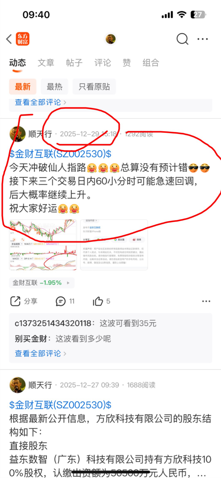 三大指数今天早上都在放量上攻,金财反着做?金财几乎连涨12个交易日。个人认为借利好出些浮利,急杀造恐杀多,修复各级背离指标。12月29日指标就背离严重了,但不可能超买无极限,所以个人认为再3个交易日应会衰竭调整。本股公开信息里没有重大问题,市场氛围也不是差。所以个人认为不用太担心,控制好仓位让子弹飞一会儿。