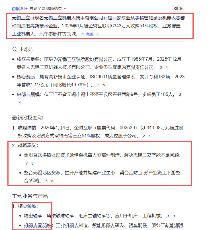 无锡三立(现名无锡三立机器人技术有限公司)是一家专业从事精密轴承及机器人零部件制造的高新技术企业,2026年1月被金财互联以6343万元收购51%股权,业务覆盖工业机器人、汽车零部件等领域。