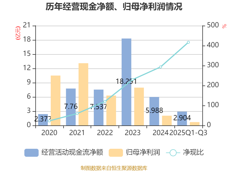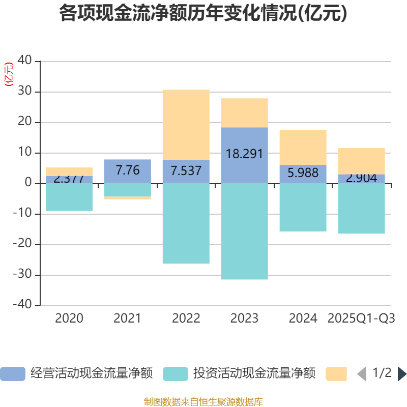 2025年前三季度,公司经营活动现金流净额为2.9亿元,同比下降54.02%;筹资活动现金流净额8.61亿元,同比增加3.82亿元;投资活动现金流净额-16.52亿元,上年同期为-12.4亿元。
