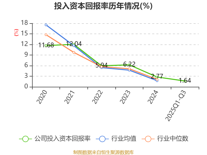 盈利能力方面, 2025年前三季度公司加权平均净资产收益率为0.78%,同比下降2.45个百分点。公司2025年前三季度投入资本回报率为1.64%,较上年同期下降1.19个百分点。