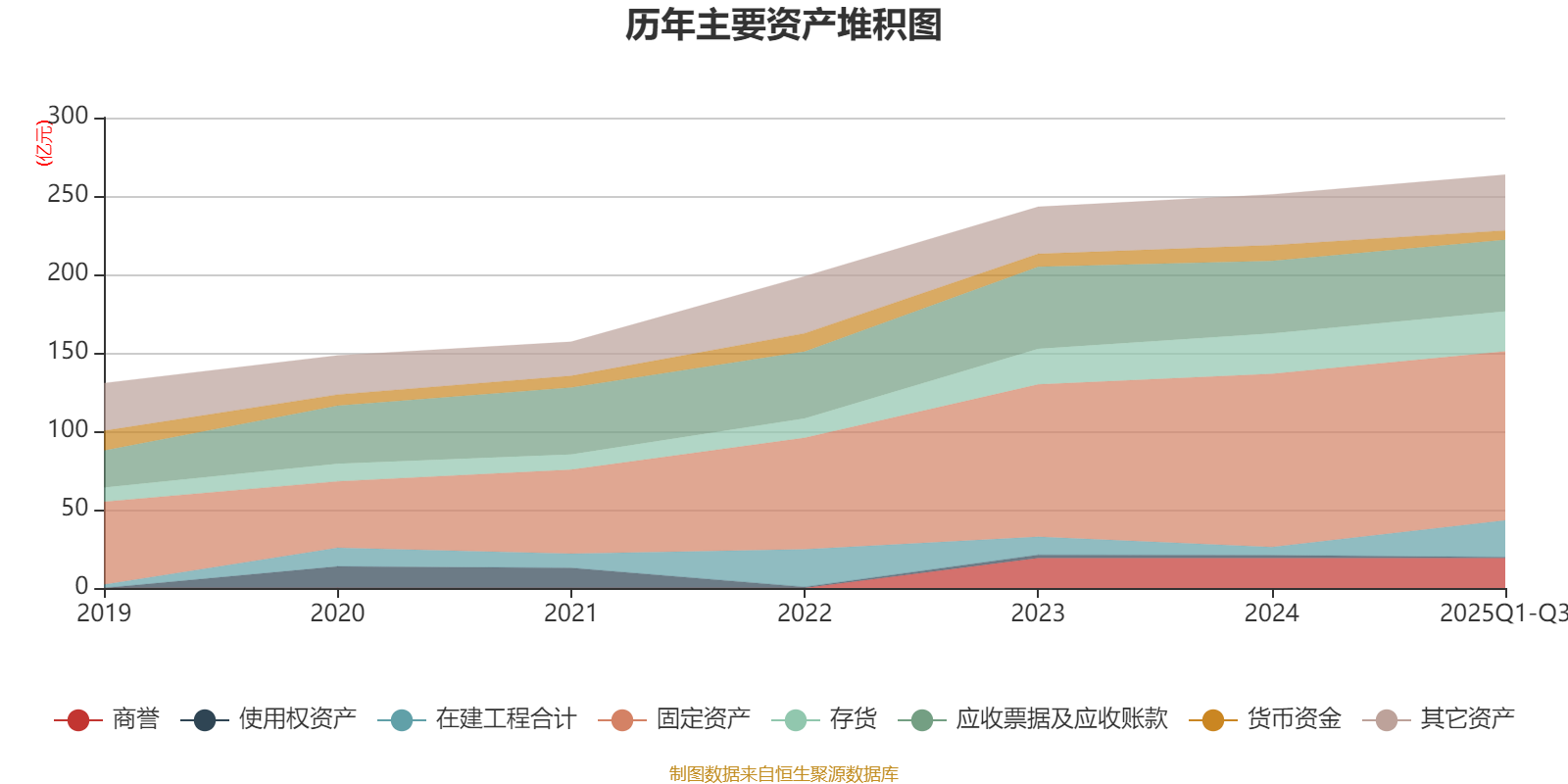 资产重大变化方面,截至2025年三季度末,公司在建工程合计较上年末增加352.76%,占公司总资产比重上升6.83个百分点;固定资产较上年末减少2.36%,占公司总资产比重下降3.1个百分点;货币资金较上年末减少39.88%,占公司总资产比重下降1.7个百分点;应收票据及应收账款较上年末减少1.28%,占公司总资产比重下降1.11个百分点。