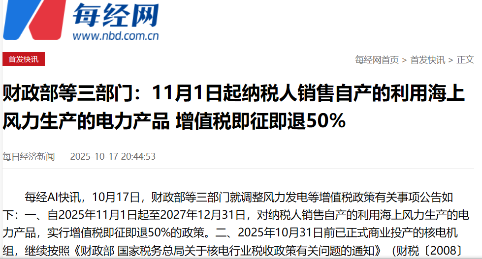 重大利好出现!海上风力生产的电力产品增值税即征即退50%!前期跌太多了!大家一起