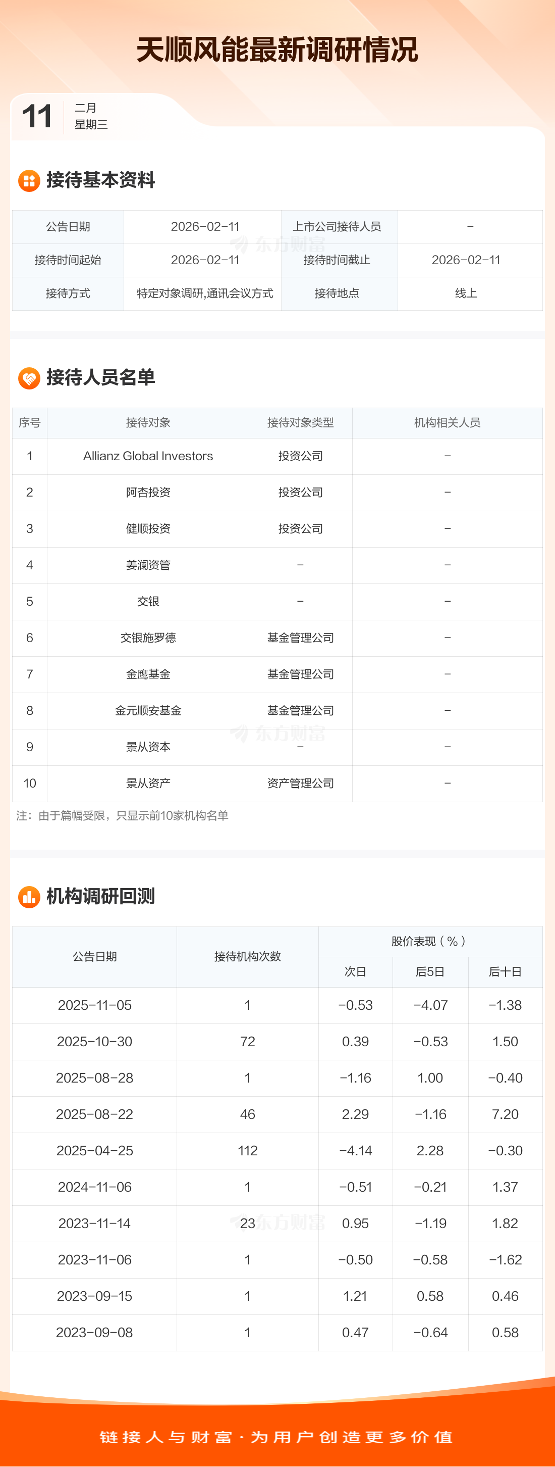 天顺风能2月11日公告称,2月11日接待Allianz Global Investors等240家机构调研。