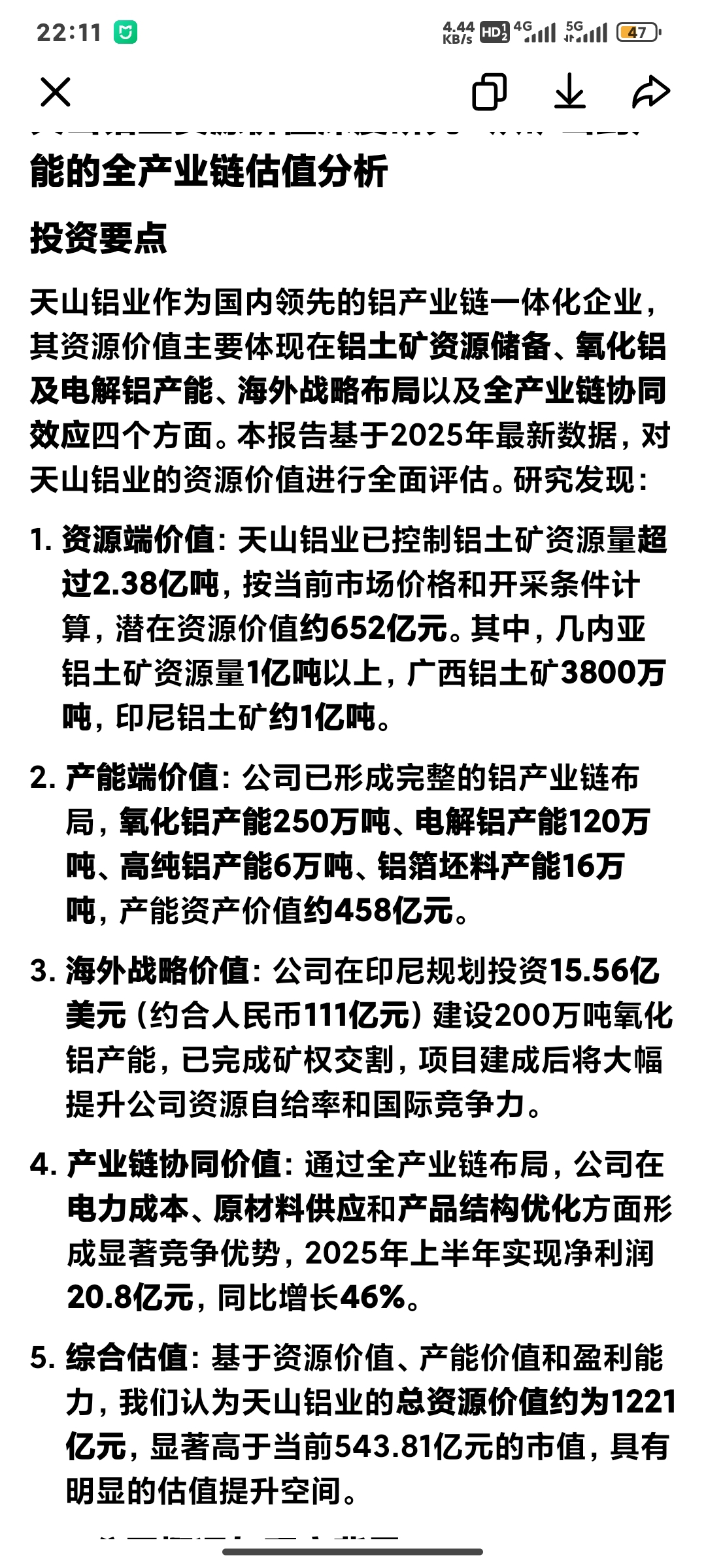 $天山铝业(SZ002532)$ 天山铝业总计估值1200亿左右。随着国家对新疆的大开发,未来几年不可估量。