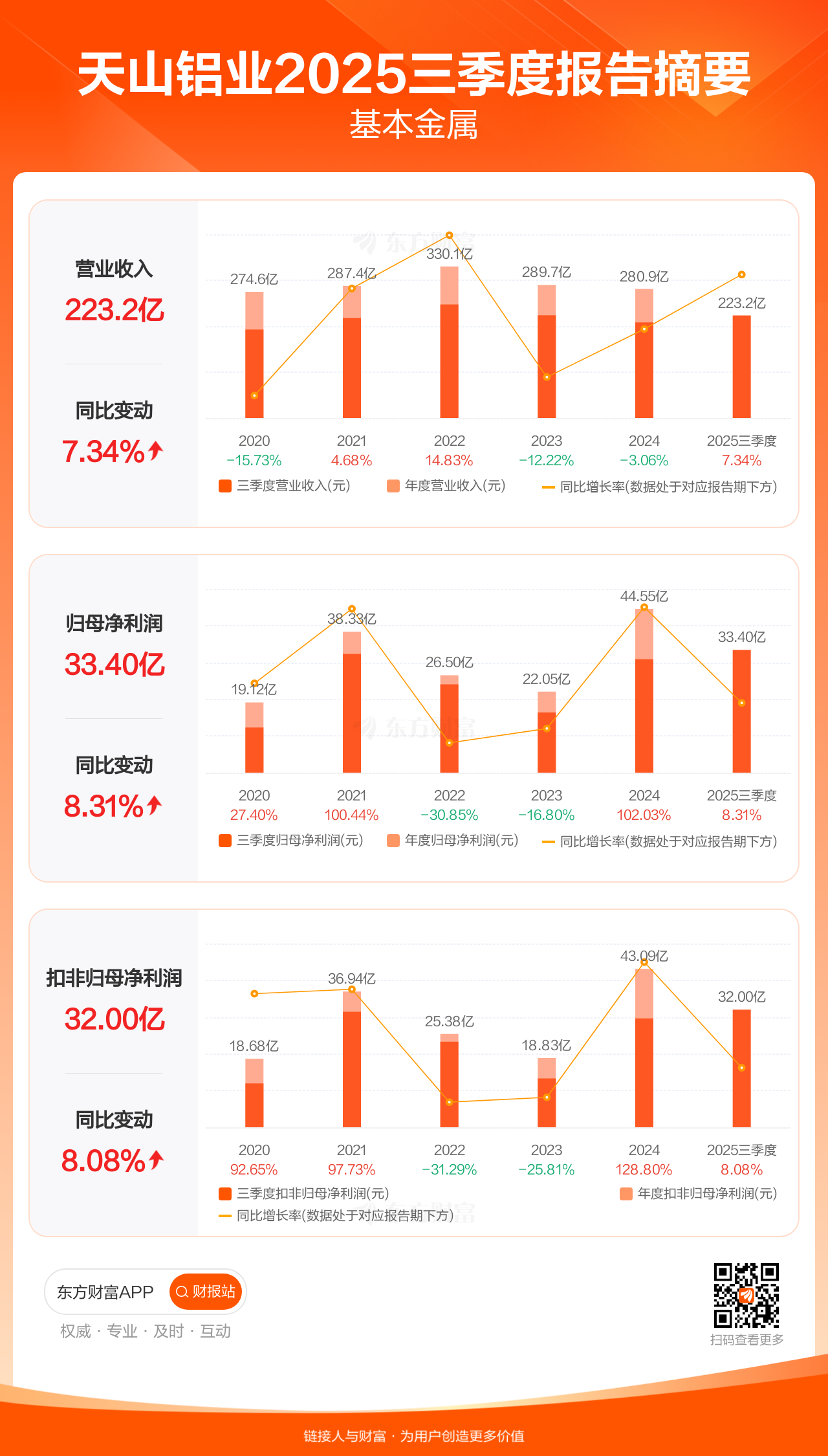 天山铝业10月25日发布2025年三季报显示,公司前三季实现营业收入223.21亿元,同比增长7.34%;归母净利润33.40亿元,同比增长8.31%;扣非归母净利润32.00亿元,同比增长8.08%
