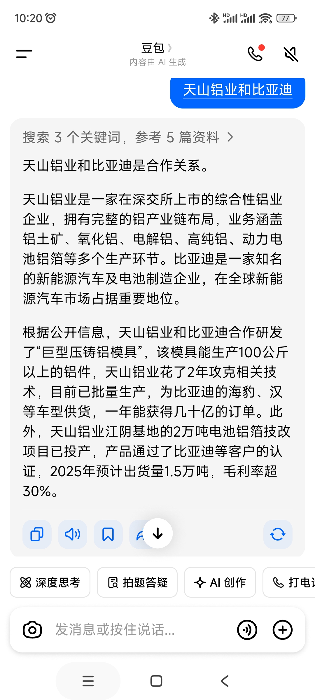 $天山铝业(SZ002532)$ 根据公开信息,天山铝业和比亚迪合作研发了“巨型压铸铝模具”,该模具能生产100公斤以上的铝件,天山铝业花了2年攻克相关技术,目前已批量生产,为比亚迪的海豹、汉等车型供货,一年能获得几十亿的订单。此外,天山铝业江阴基地的2万吨电池铝箔技改项目已投产,产品通过了比亚迪等客户的认证,2025年预计出货量1.5万吨,毛利率超30%。