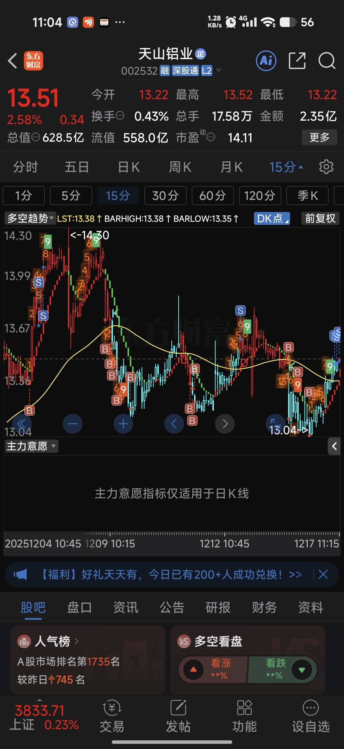 $天山铝业(SZ002532)$ 有人笑我不会做短音。我用100万试试,