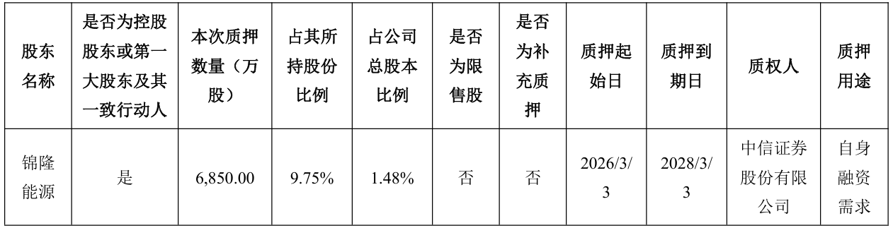 3月4日晚间,天山铝业(002532)发布公告称,控股股东锦隆能源将其持有的6850万股公司股份质押给中信证券,用于自身融资需求,质押期限自2026年3月3日至2028年3月3日,本次质押股份占其持股比例的9.75%,占公司总股本的1.48%。