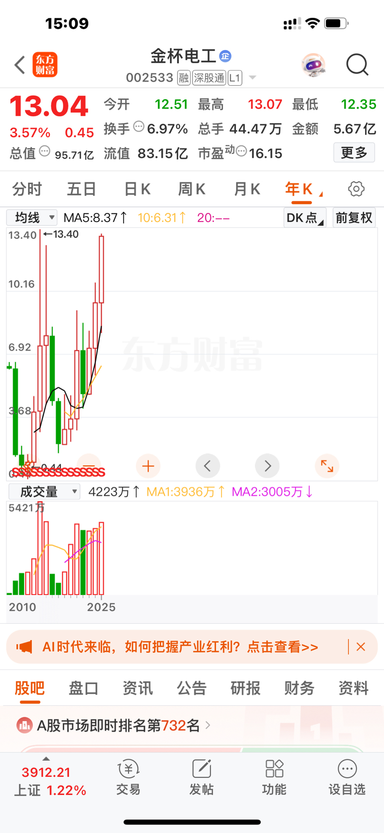 $金杯电工(SZ002533)$ 今天金杯电工比前两天温和放量,许多人都惜售,持有筹码或许能获得财务自由。上无阻力,上升空间彻底打开,明天可能见14元,春节前20元胜利在望。