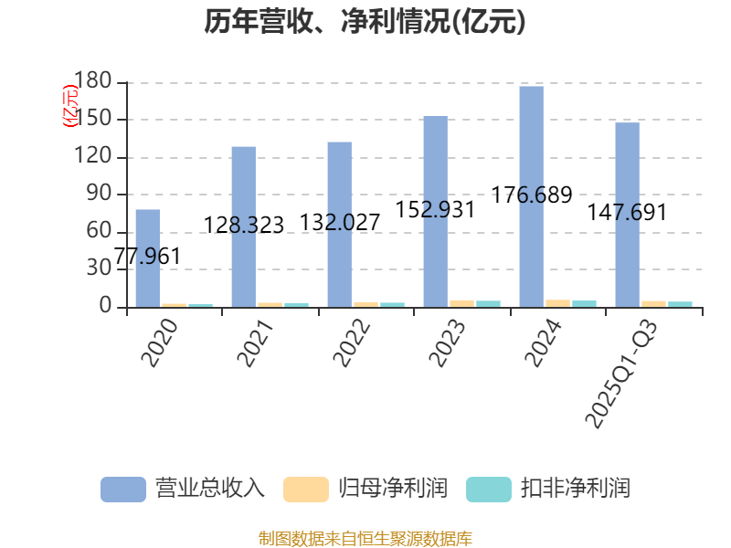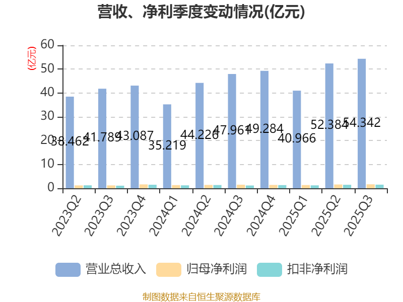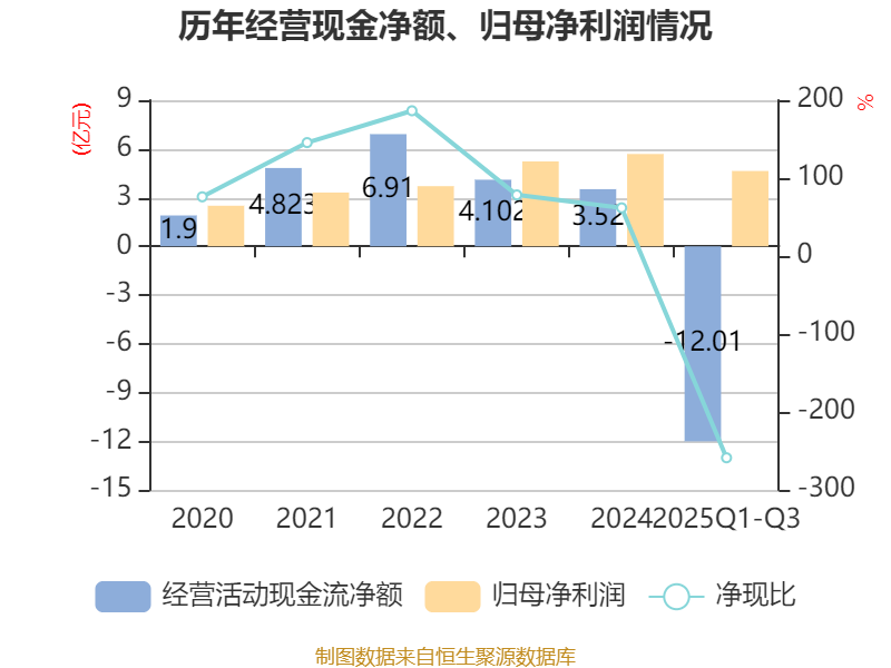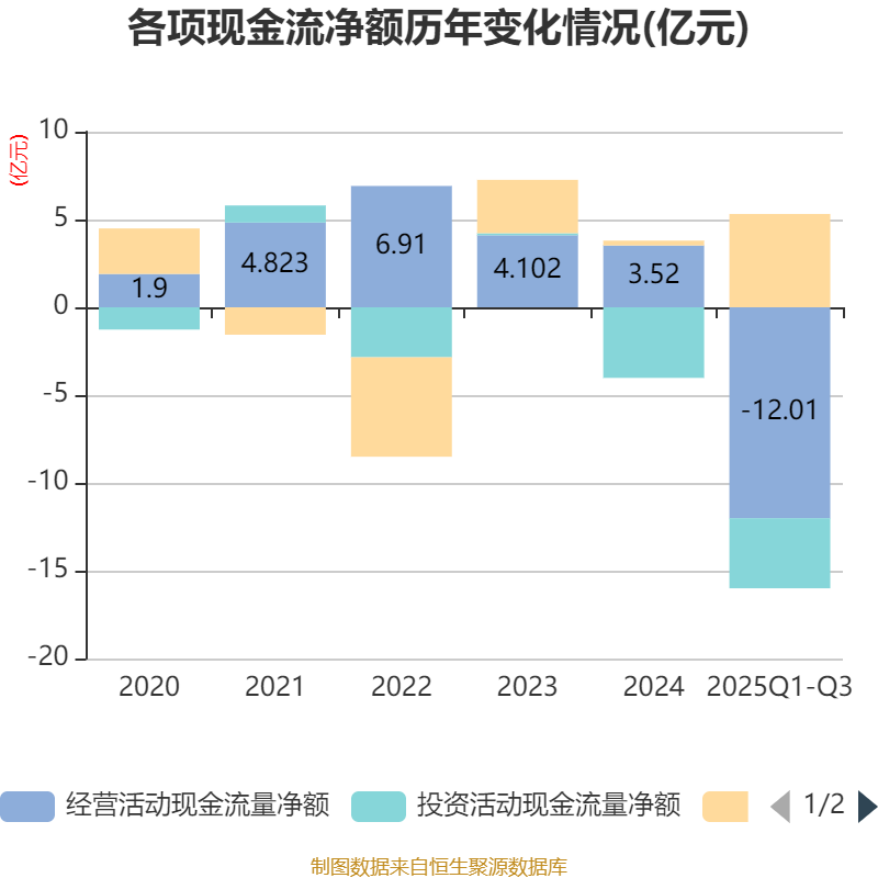 2025年前三季度,公司经营活动现金流净额为-12.01亿元,同比减少7.26亿元;筹资活动现金流净额5.32亿元,同比增加3.65亿元;投资活动现金流净额-3.99亿元,上年同期为-6.22亿元。