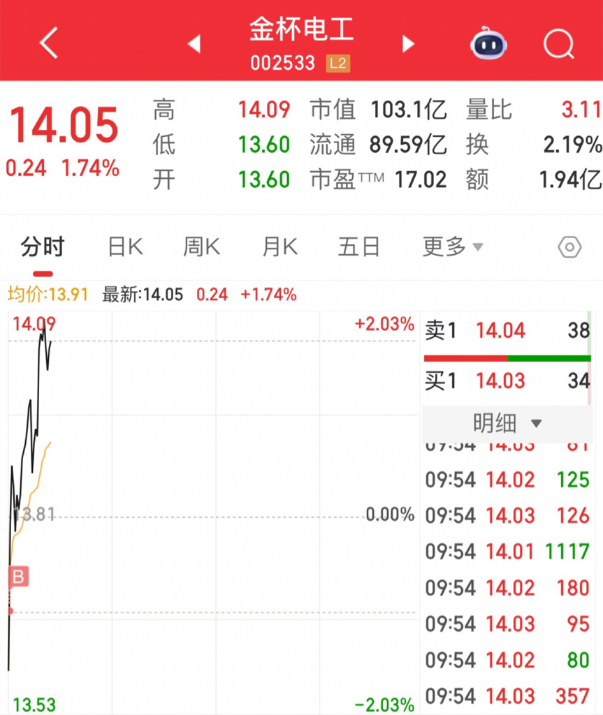 电力方向昨天首次分歧今天估计有资金做预期差,但分歧早了有些丢失板块强势预期后头还是走聚焦+趋势路线更多,这个路线也贴合指数,指数接下来有主升转震荡再突破预期,$金杯电工(SZ002533)$ 找机会低吸