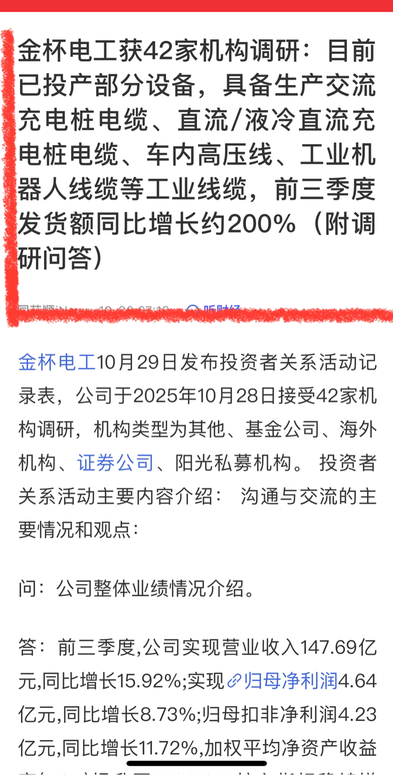 $金杯电工(SZ002533)$ 公司于2025年10月28日接受42家机构调研,机构类型为其他、基金公司、海外机构、证券公司、阳光私募机构。 投资者关系活动主要内容介绍: 沟通与交流的主要情况和观点: