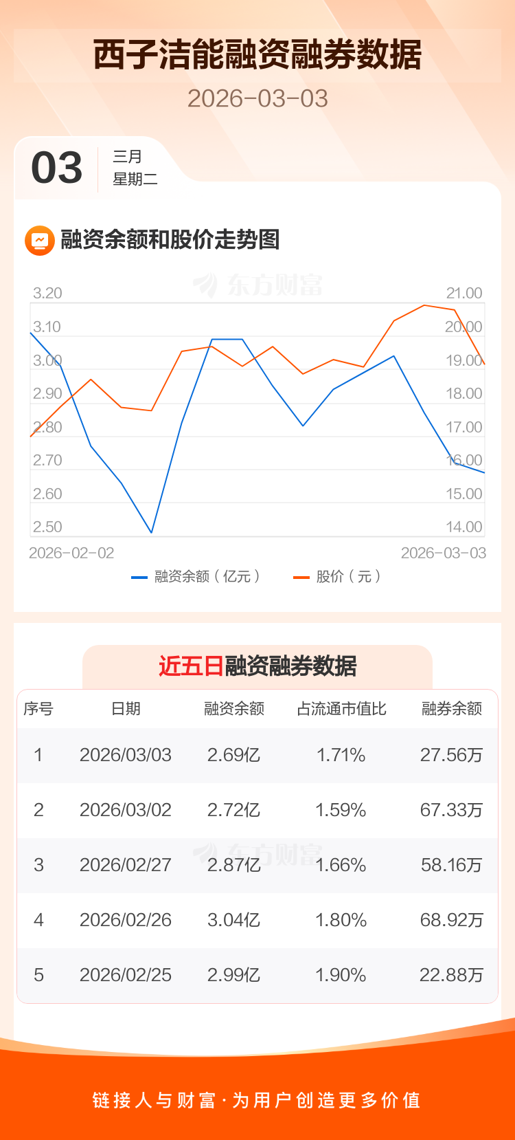 交易所最新数据显示,西子洁能于2026年3月3日获融资买入4584.59万元,融资偿还4857.96万元,当日融资净偿还273.38万元。目前,该股融资余额2.69亿,占流通市值比例为1.71%。