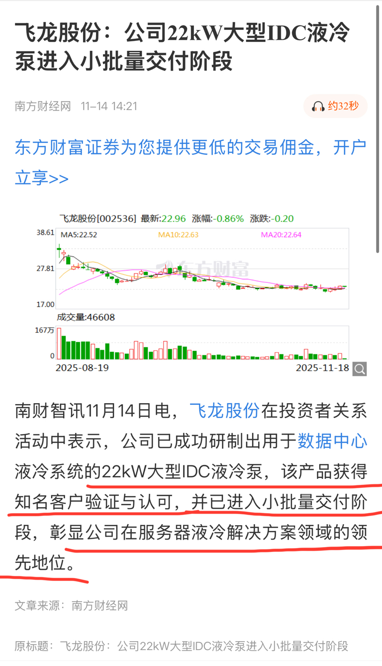 飞龙股份在投资者关系活动中表示,公司已成功研制出用于数据中心液冷系统的22kW大型IDC液冷泵,该产品获得知名客户验证与认可,并已进入小批量交付阶段,彰显公司在服务器液冷解决方案领域的领先地位。