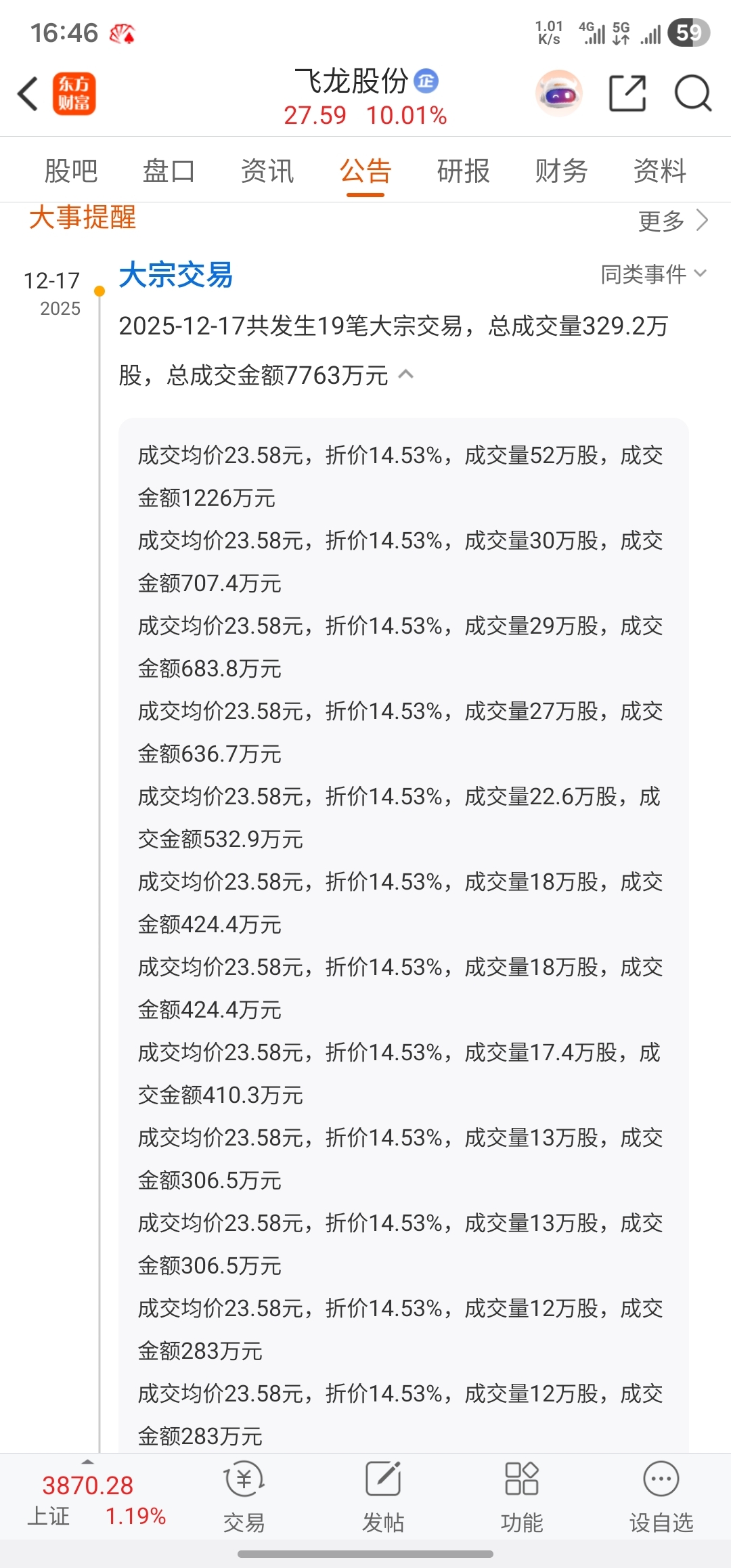 $飞龙股份(SZ002536)$ 机构开始大宗交易拿低价货啦,,注意风险,小心出货套你们