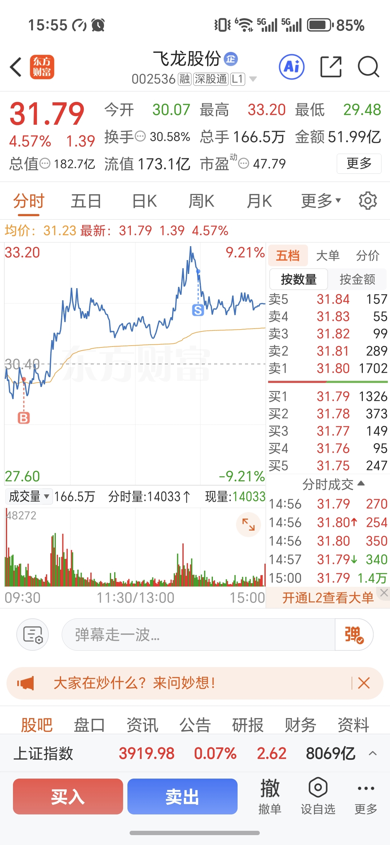 $飞龙股份(SZ002536)$ 勾庄,纯属跟风吧,被动拉升发套,明天卖吗