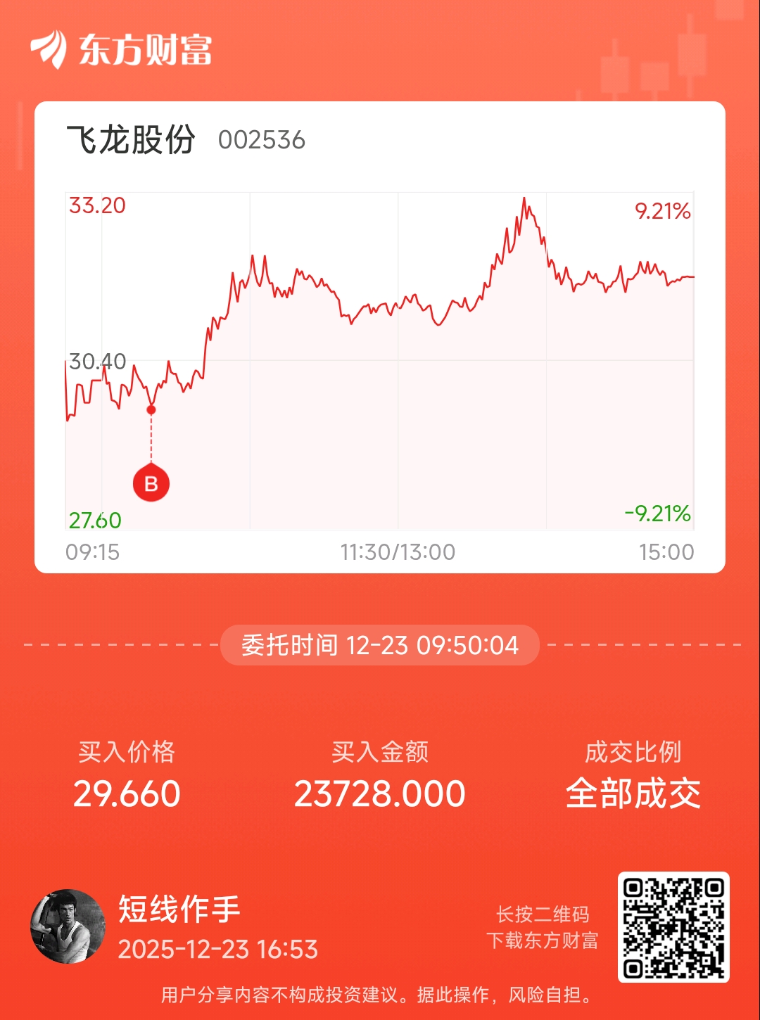 委托标的:飞龙股份买卖方向:5成仓位买入笔记:机构票买阴不买阳