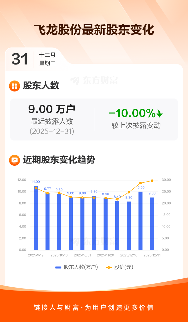 飞龙股份最新披露数据显示,截至12月31日公司股东户数为9.00万户,较上期(2025年12月19日)减少1.00万户,降幅为10.00%。户均持有流通股数量由上期的5444股上升至6049股,户均持股金额由上期的15.61万元增加至17.97万元。