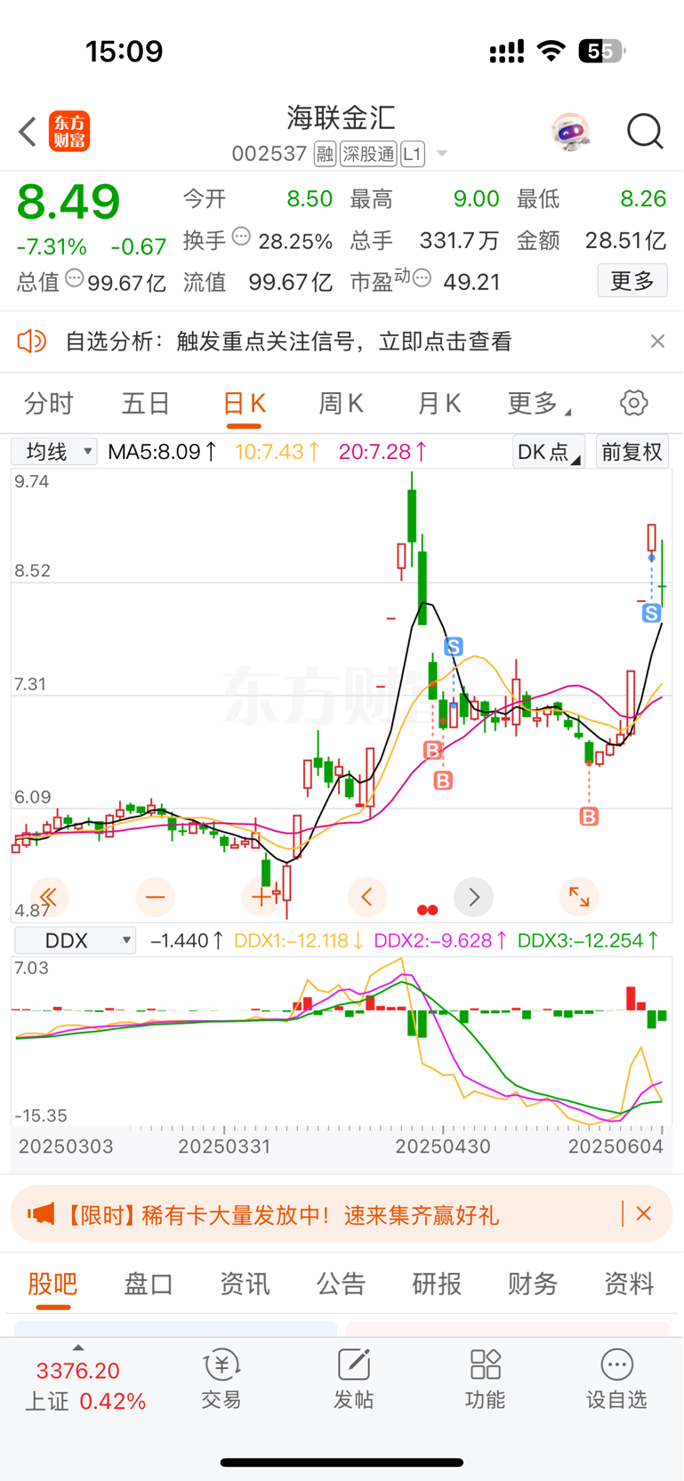 $海联金汇(SZ002537)$ 在这里前几年亏了10个W,也算是操作对了一次