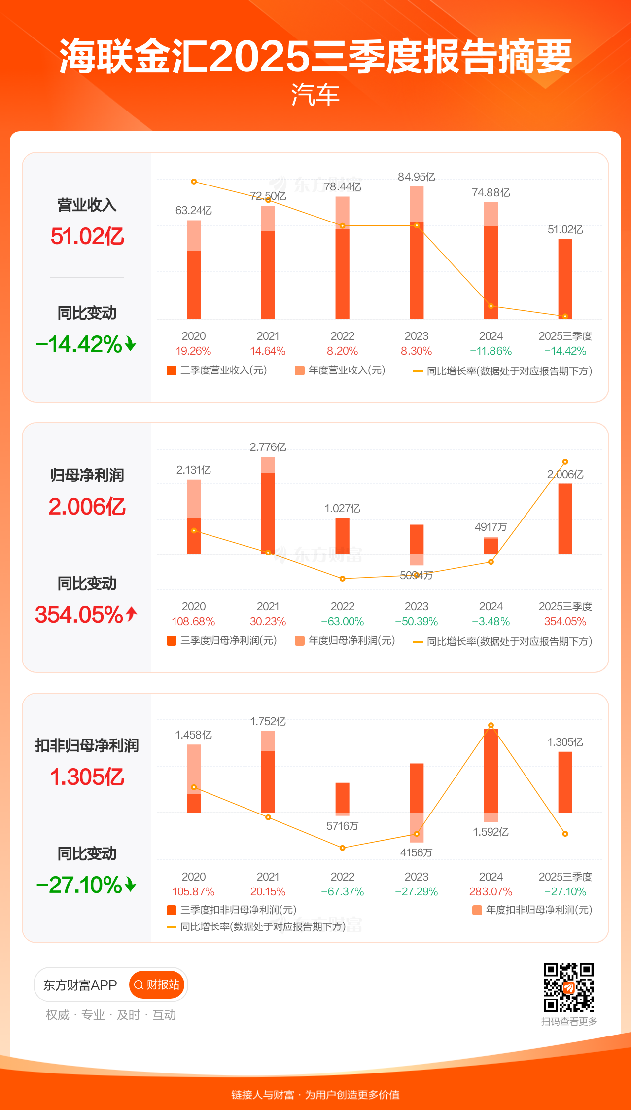 海联金汇10月29日发布2025年三季报显示,公司前三季实现营业收入51.02亿元,同比下滑14.42%;归母净利润2.01亿元,同比增长354.05%;扣非归母净利润1.31亿元,同比下滑27.10%。