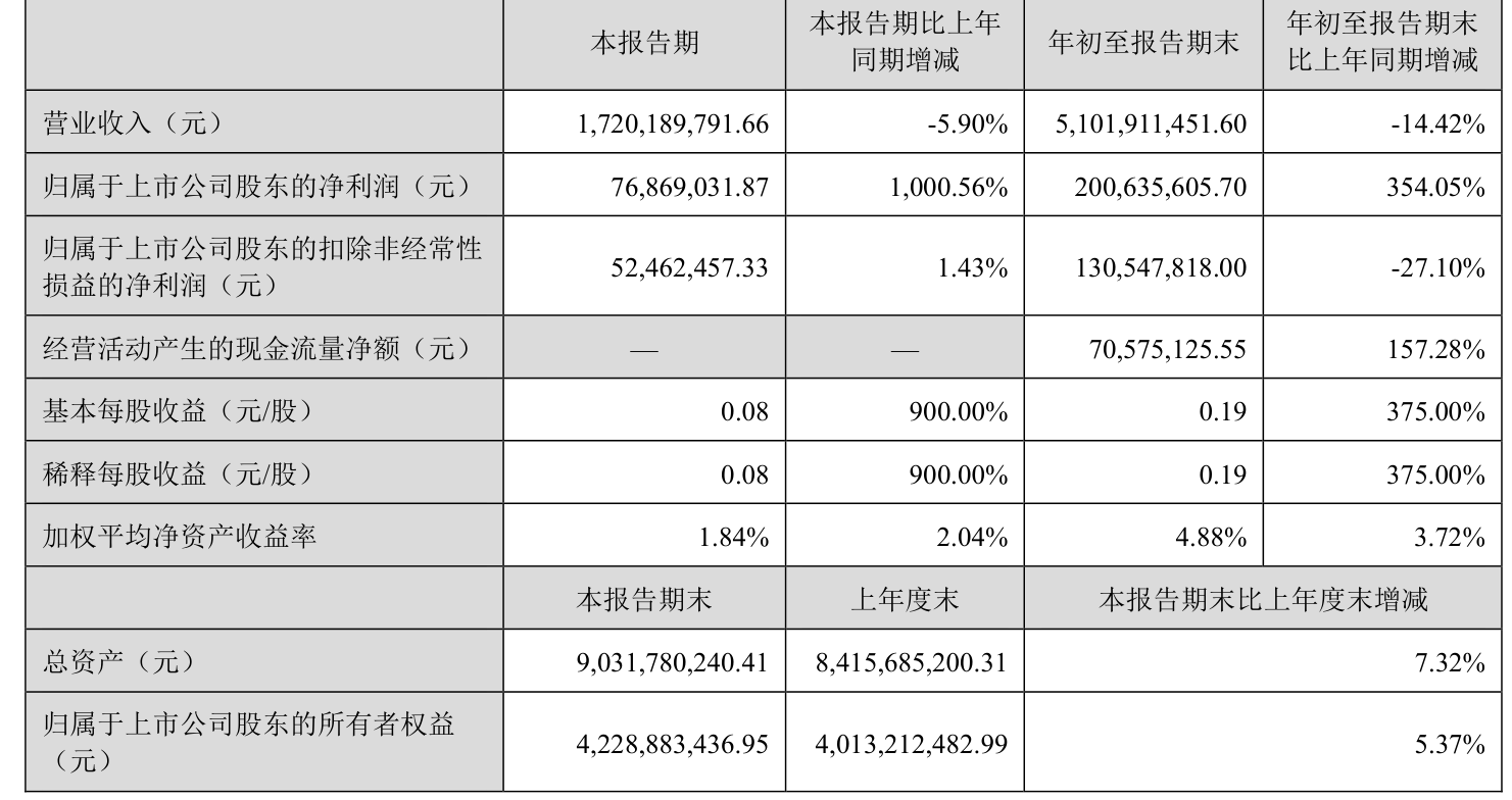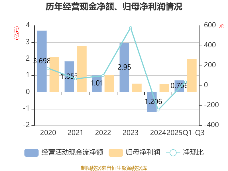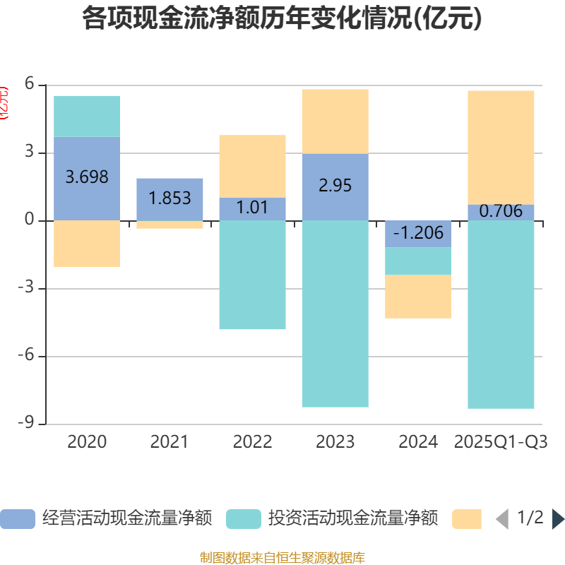 2025年前三季度,公司经营活动现金流净额为7057.51万元,同比增加1.94亿元;筹资活动现金流净额5.03亿元,同比增加5.62亿元;投资活动现金流净额-8.34亿元,上年同期为-3.74亿元。