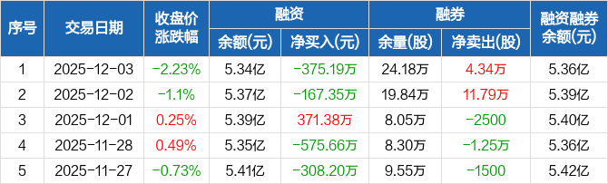 海联金汇:融资净偿还375.19万元,融资余额5.34亿元(12-03)