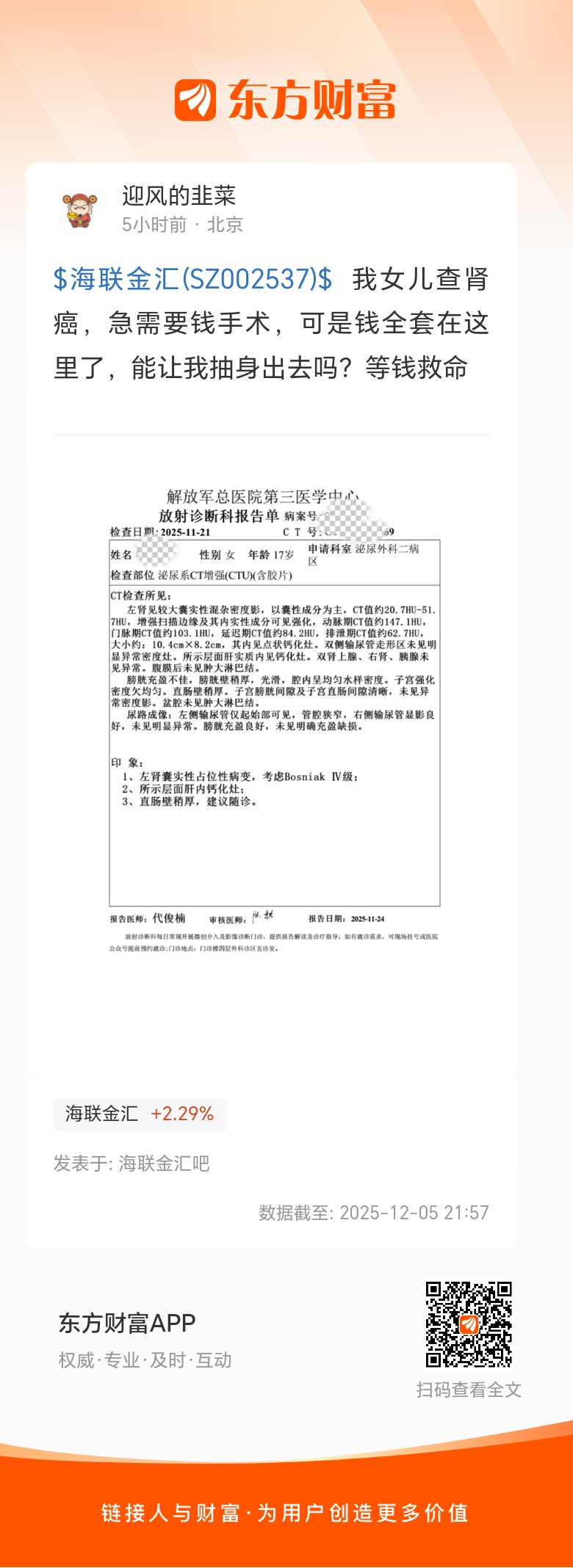 $海联金汇(SZ002537)$  我女儿查肾癌,急需要钱手术,可是钱全套在这里了,能让我抽身出去吗?等钱救命