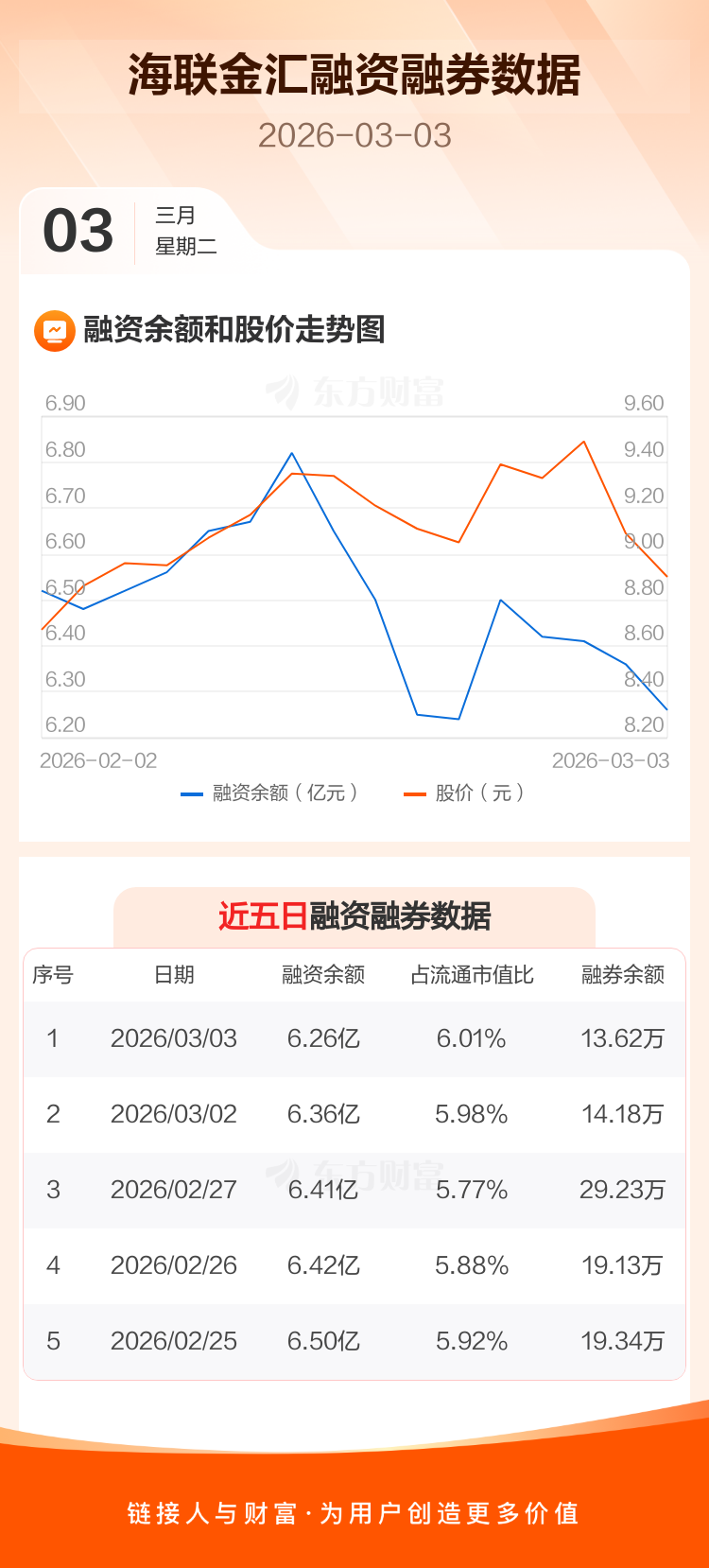 交易所最新数据显示,海联金汇于2026年3月3日获融资买入4920.89万元,融资偿还5901.24万元,当日融资净偿还980.35万元。目前,该股融资余额6.26亿,占流通市值比例为6.01%。