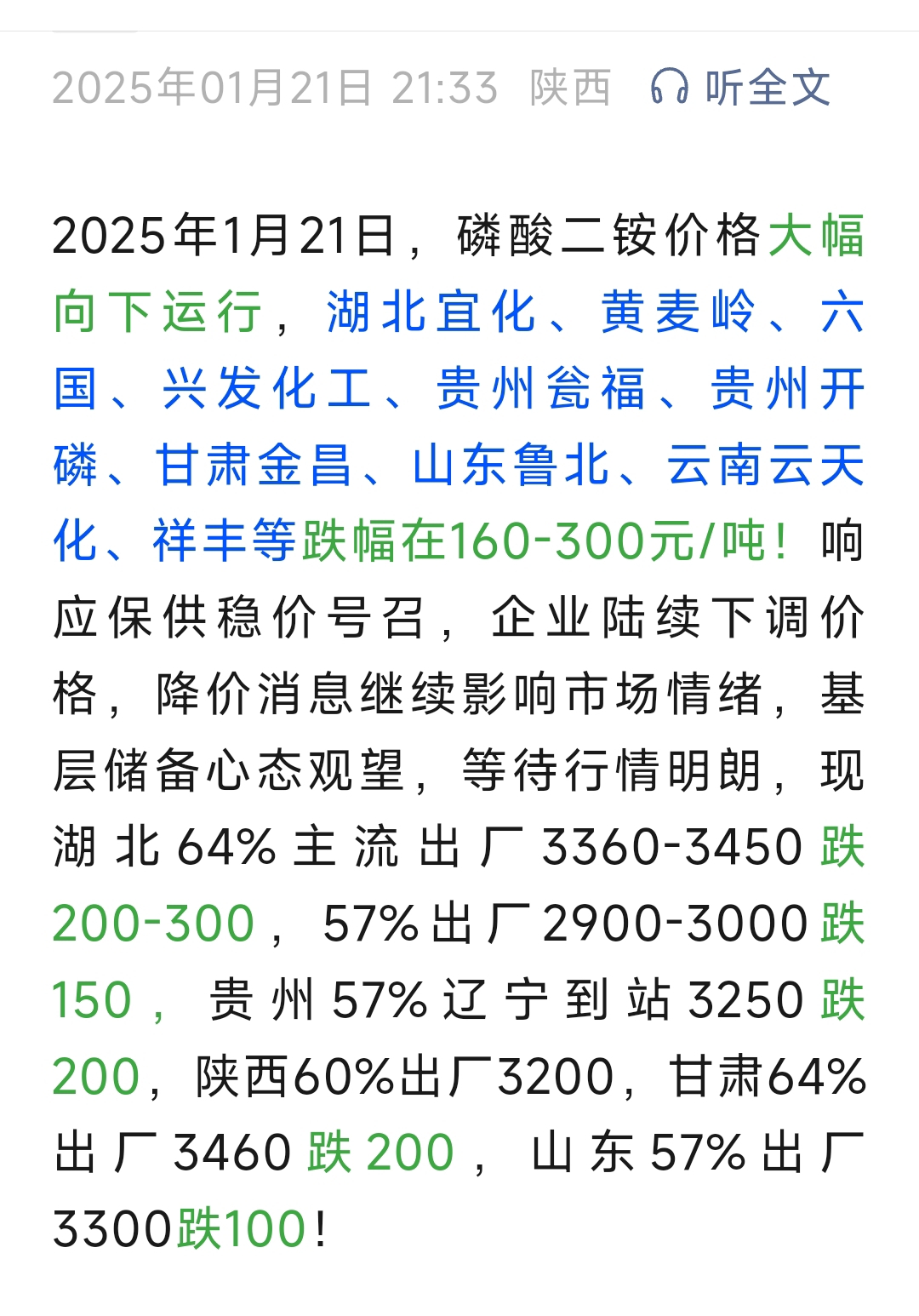 $司尔特(SZ002538)$ 1月21日,为响应保供稳价号召,企业陆续下调价格,磷酸二铵大幅降价,司尔特今年的业绩难保。