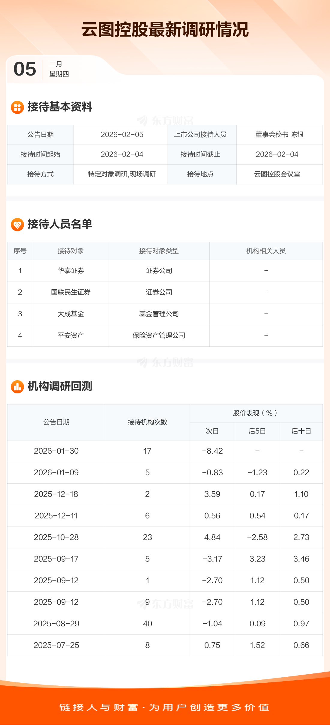云图控股2月5日公告称,2月4日接待华泰证券等4家机构调研。接待人员包括董事会秘书 陈银。