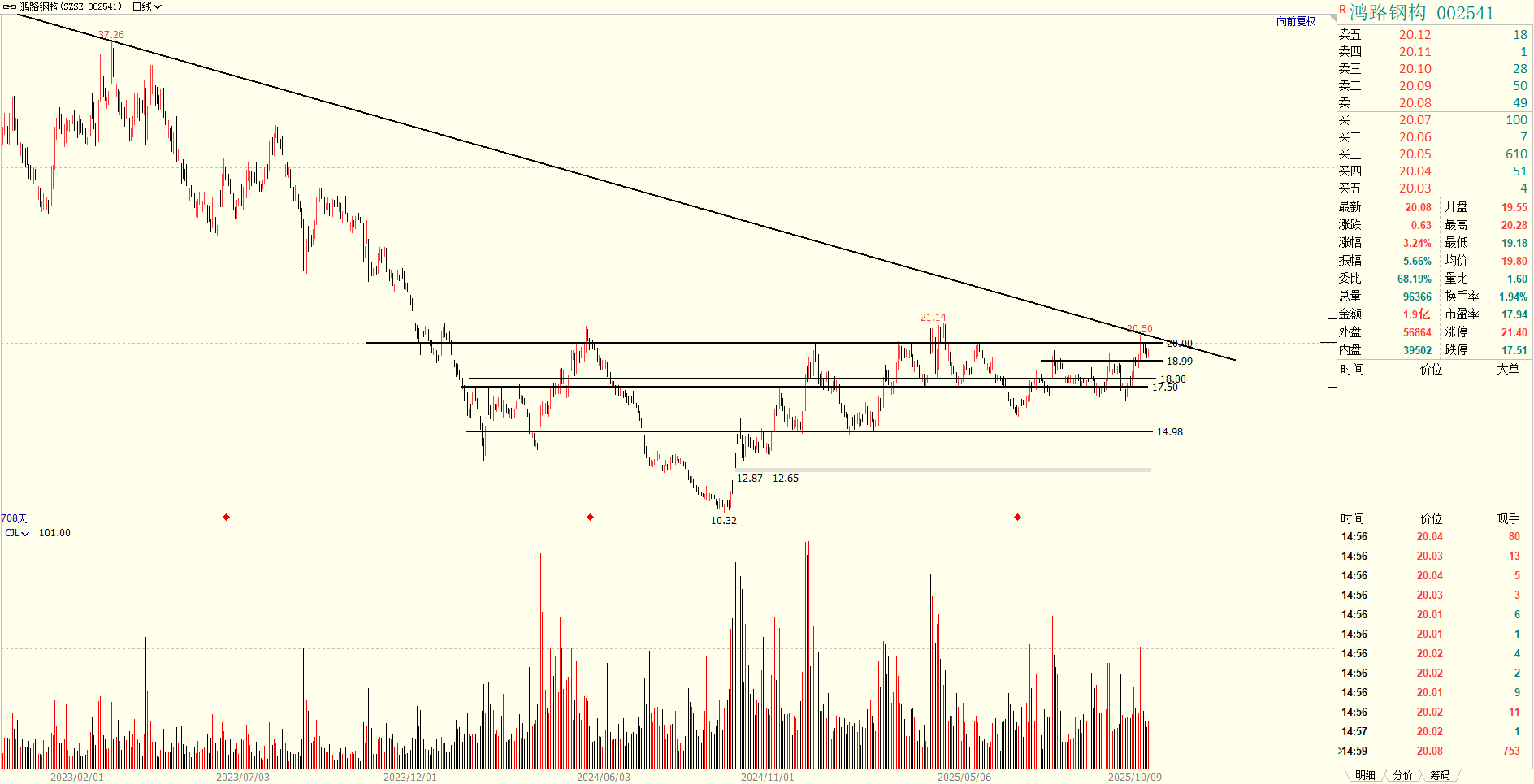 一把直尺打天下/鸿路钢构15-20之间震荡,为大规模头肩底,趋势目标40;区间内