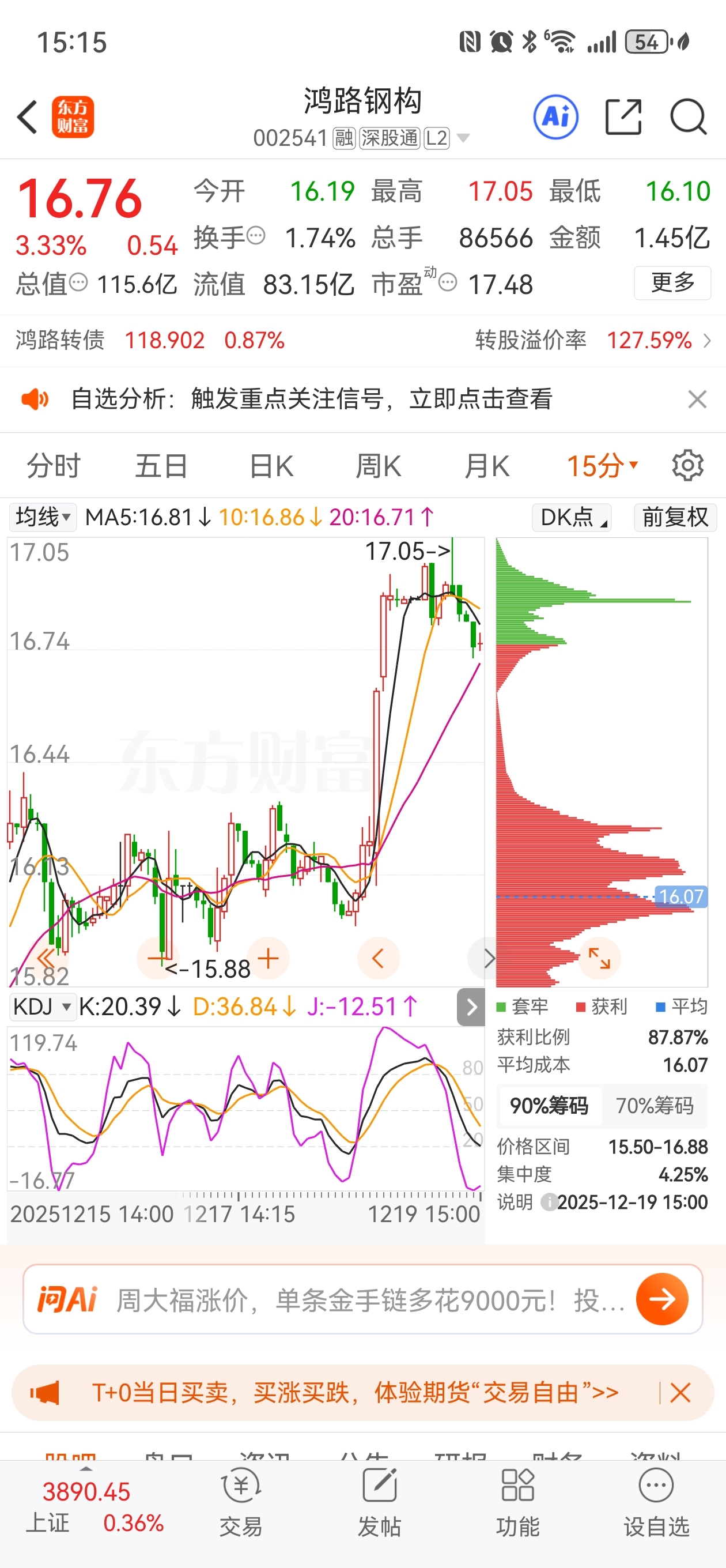 $鸿路钢构(SZ002541)$ 验证一下我的猜想对不对,今天还是没卖,kdj(j值)15分钟线似乎又有修复需求,看下周能不能站稳17,尝试冲击18
