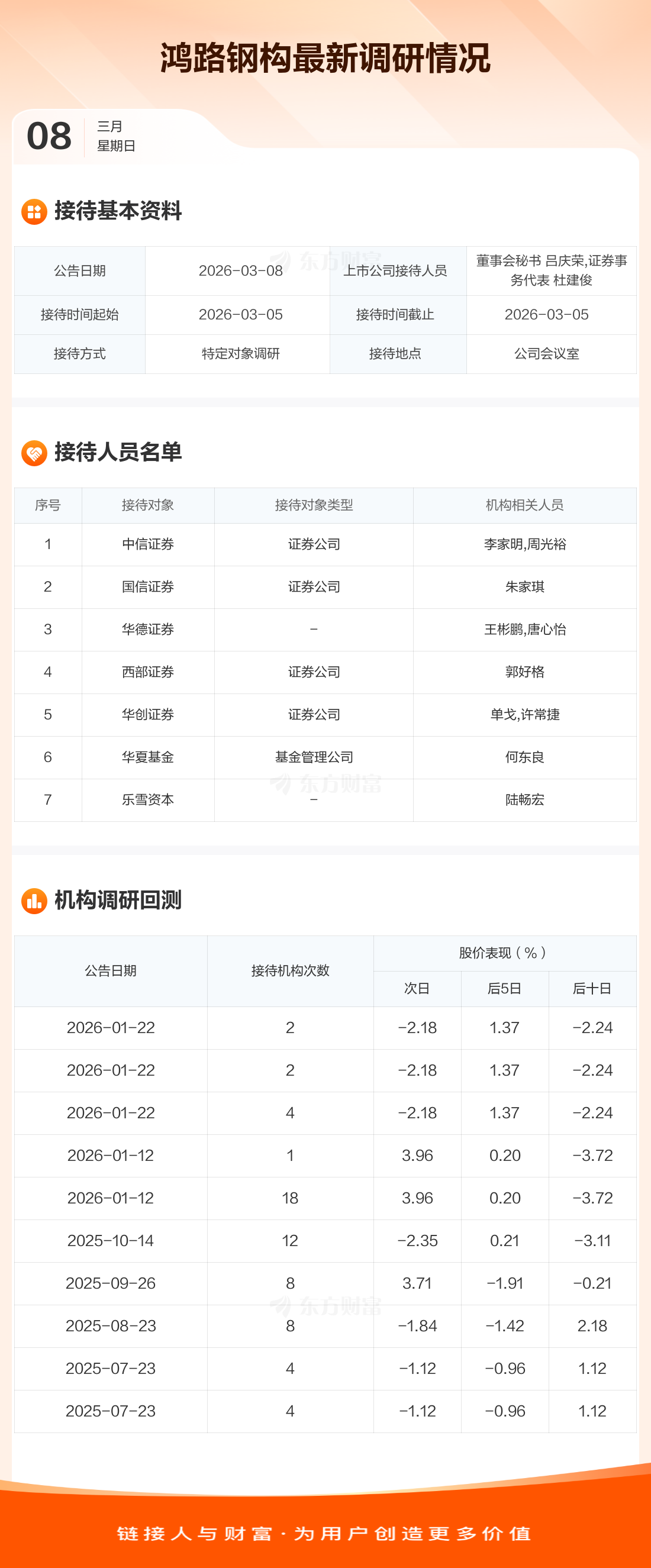 鸿路钢构3月8日公告称,3月5日接待中信证券等7家机构调研。接待人员包括董事会秘书 吕庆荣,证券事务代表 杜建俊。