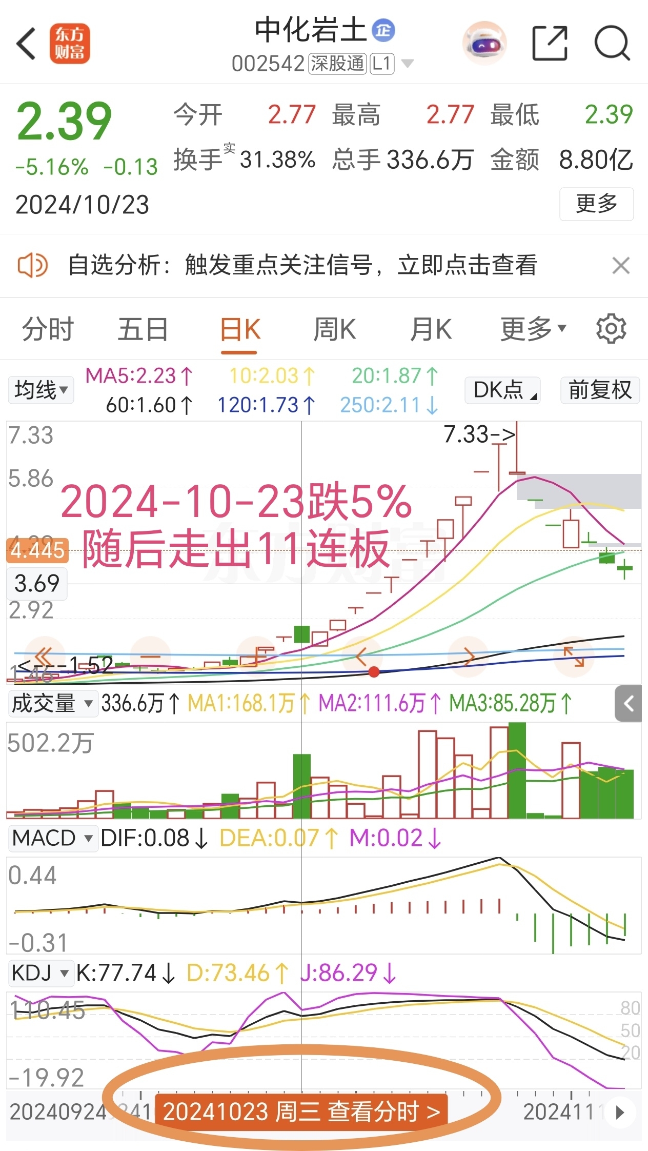 $中化岩土(SZ002542)$ 历史总是惊人的相似。2024年10月18号开始第一个涨停,随后的10月23号(霜降节气)大跌5%,接着开启11连板。2025年10月21号开启第一次涨停,今天10月23号(霜降节气)大跌5%左右。能否开启11连板?拭目以待。
