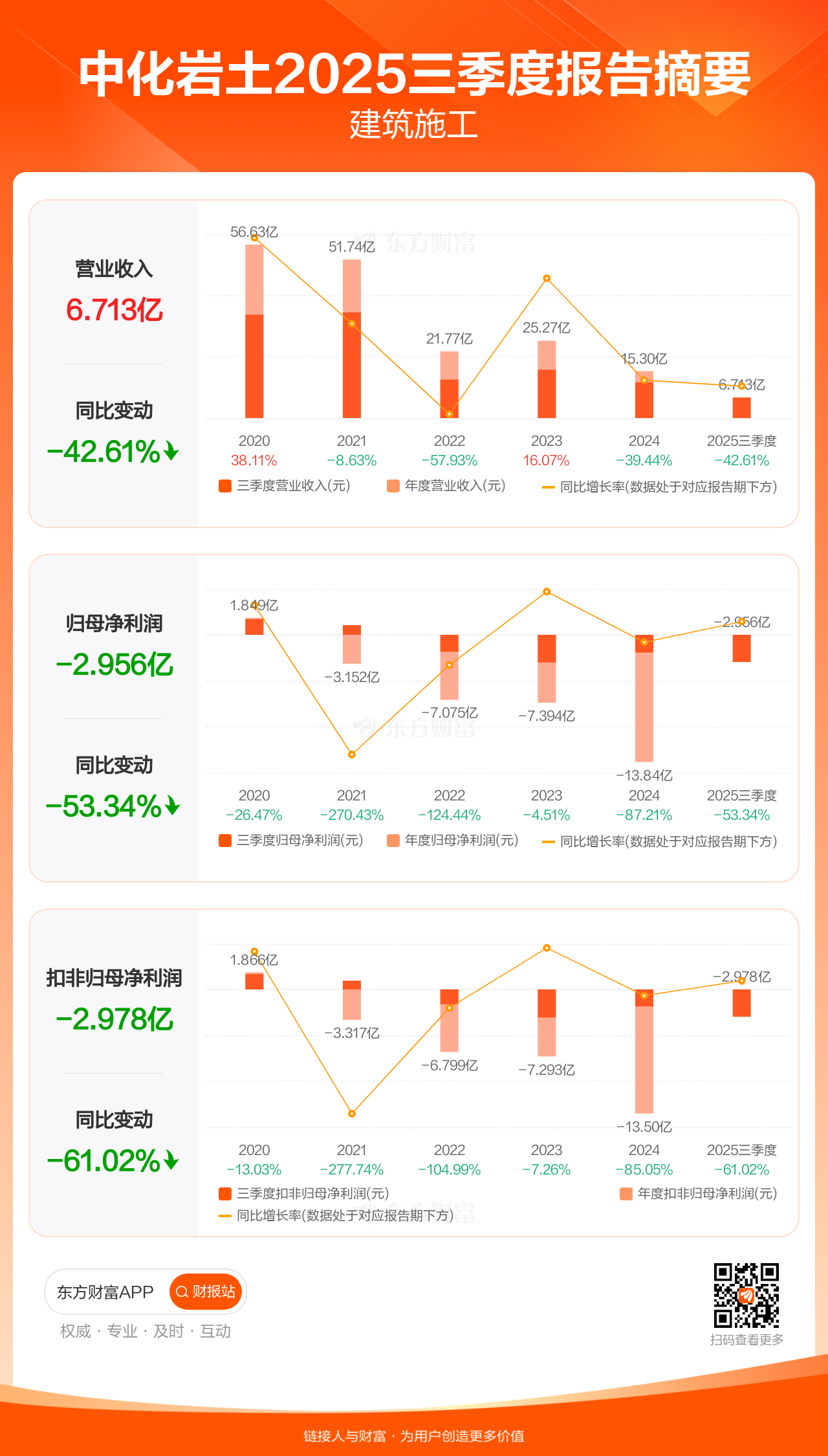 中化岩土10月31日发布2025年三季报显示,公司前三季实现营业收入6.71亿元,同比下滑42.61%;归母净利润-2.96亿元;扣非归母净利润-2.98亿元。