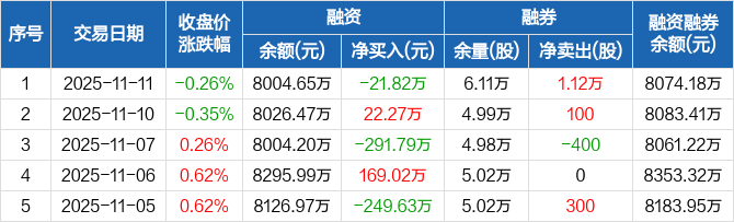 万和电气:融资净偿还21.82万元,融资余额8004.65万元(11-11)