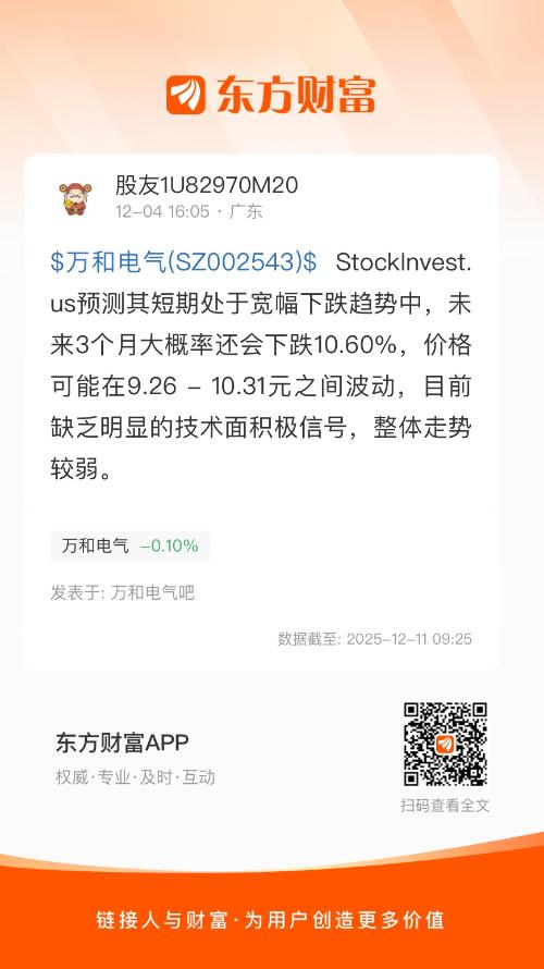 $万和电气(SZ002543)$ StockInvest.us预测其短期处于宽幅下跌趋势中,未来3个月大概率还会下跌10.60%,价格可能在9.26 - 10.31元之间波动,目前缺乏明显的技术面积极信号,整体走势较弱。
