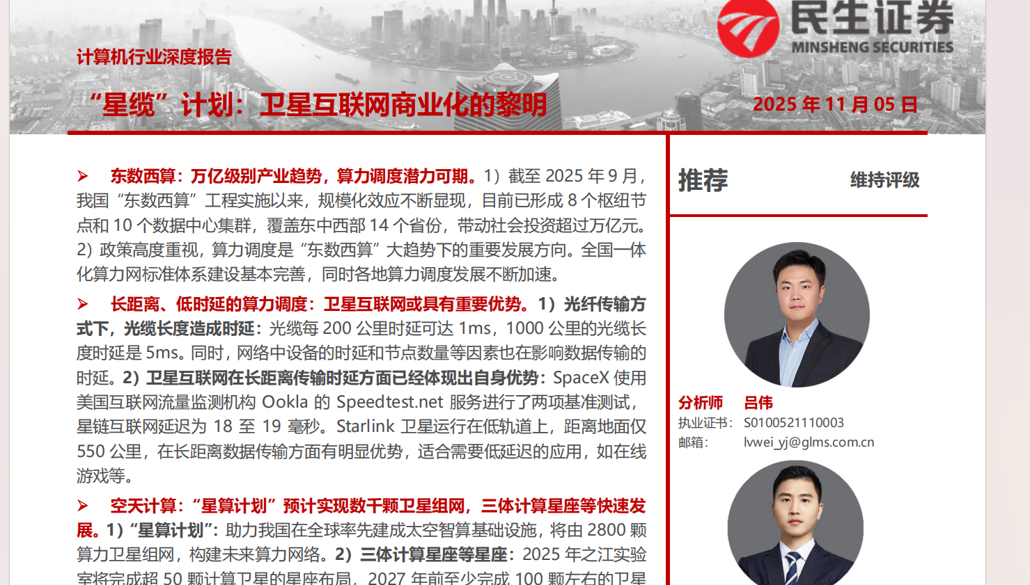 民生证券,标题星缆计划,卫星互联网商业化的黎明 这篇研报可以细看